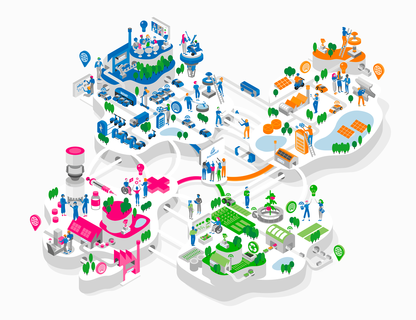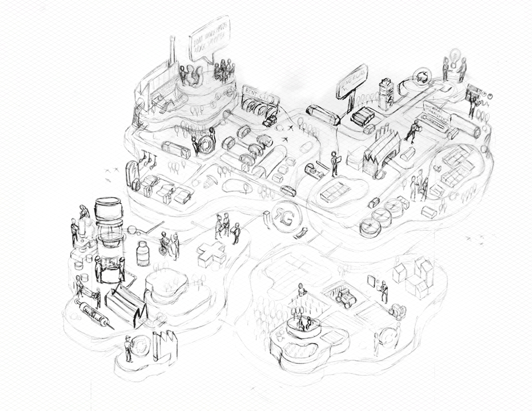 Mobility, Energies, Life and Agriculture. They are represented as islands, all linked to each other.